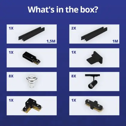 Complete Set 1-Phase Rail L 1,5 x 2 Meter Black | incl. 8x Spot + GU10 2700K 3W Dimmable + End Cap, Power Connector and L -Connector