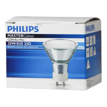 CDM-Rm Mini is equipped with a reflector that can reflect the light in a specific direction. Any-Lamp offers three different diffusion angles in this range: 10D, 25D and 40D. The 10D offers light directed at a particular point. With their GX10 base, Philips CDM-R Mini 20W 830 GX10 MR16 25D easily integrate into all light fixtures. These lamps are designed to replace halogen lamps with the same base. The average lifespan of Philips CDM-R Mini 20W 830 GX10 MR16 25D is 15000 hours, which corresponds to approximately 4 years of use.